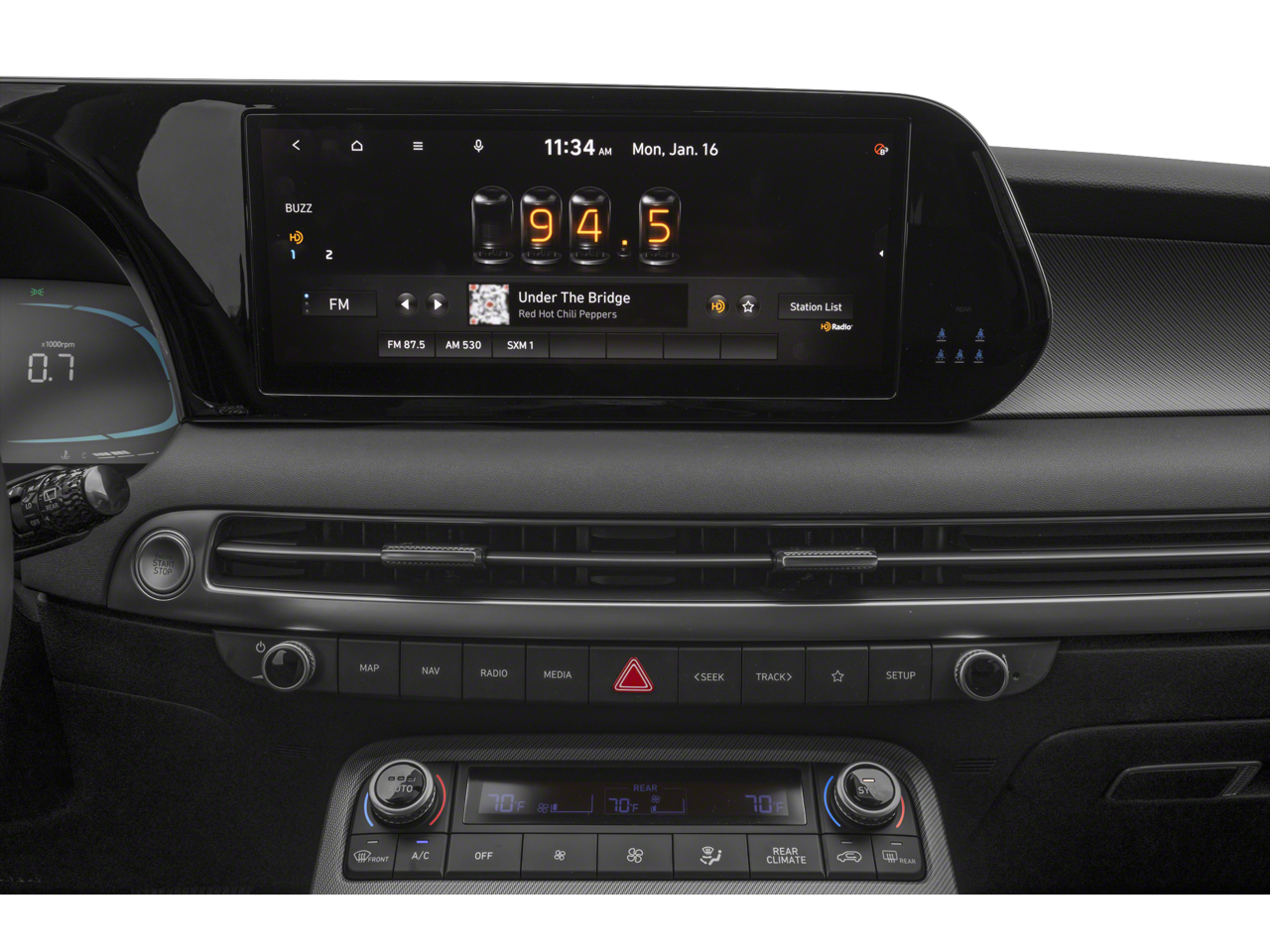 - Radio: AM/FM/MP3 Audio System -inc: 12.3" color touchscreen display, onboard navigation w/traffic flow including incident data via HD Radio (HERE), Over-the-Air (OTA) map updates, SiriusXM, USB, Android Auto and Apple CarPlay, dynamic voice recognition, rear seat quiet mode, Bluetooth hands-free connectivity w/multiple device connection and Bluelink Connected Car System